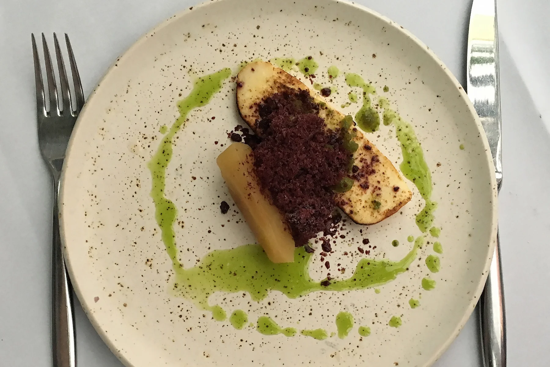 Then we tried Root Plant with Pastille (beetroot with black currants, carrots with sea buckthorn, and parsnip with apple and goat cheese meringue)- our least favorite was the carrot one, but we generally loved this. Same as the next three dishes, it was paired with excellent Kolonist Chardonnay.